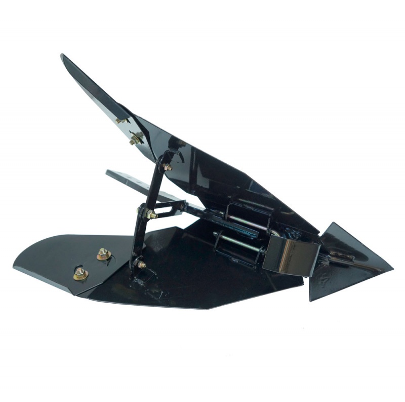 Регулируемый окучник и плуг крепятся вместо сошника (опорная пластина с отверстиями, идёт в комплекте с мотоблоком).