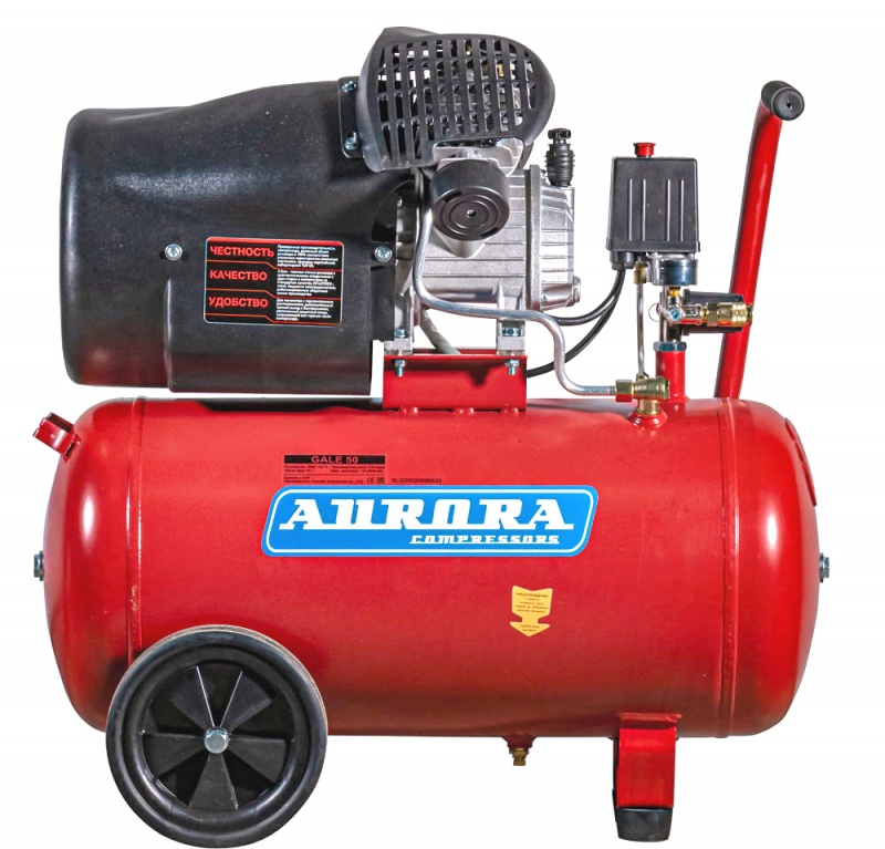 GALE 50 – самый мощный однофазный компрессор с прямым приводом в ассортименте Aurora. Безусловный бестселлер последних лет из-за отличного соотношения долговечности, производительности и доступной цены. Устройство отличают честные характеристики, увеличенный объём 2х цилиндров, диаметром 48мм каждый и V-образная «голова». Мощный электромотор гарантирует поддержание стабильных оборотов (не ниже 2850 об/мин) во всём диапазоне рабочих давлений. Максимальное значение давления – 8 Бар. Ресивер аппарата изготовлен с учётом европейских требований к безопасности и качеству сосудов под давлением, о чём на корпусе имеется соответствующая шильда.