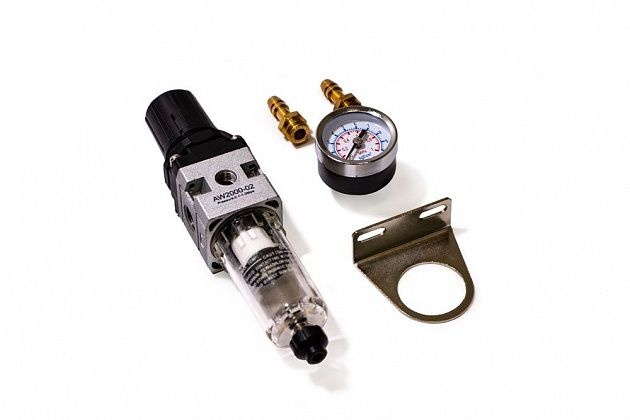 Воздушный фильтр-регулятор предназначен для установки на аппараты плазменной резки. Устройство подготавливает воздух подаваемый компрессором и очищает его от влаги и частиц масла. Фильтр-регулятор оснащён манометром и рукояткой управления давлением.